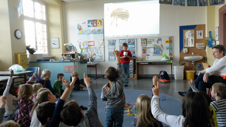 Während Kartoffeln und Äpfel auf dem Herd köcheln, nutzt die Klasse die Zeit für die letzten anstehenden Experten-Vorträge: So lernen die Erstklässler heute nicht nur einiges über den Kartoffelkäfer, sondern sie erfahren auch, was beim Präsentieren wichtig ist.