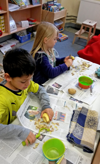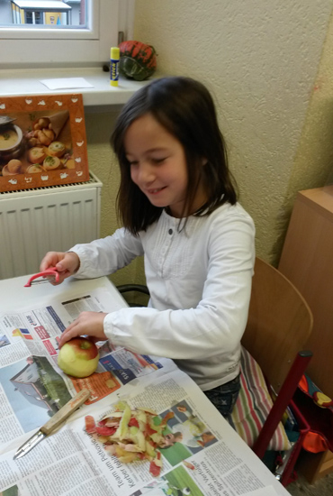 Nachdem die Erstklässler einiges über Äpfel und die Drittklässler über Kartoffeln gelernt haben, beendet die Klasse die Lerneinheit mit einem gemeinsamen Kochtag: Gemeinsames Äpfel- und Kartoffelschälen ist angesagt. Groß hilft Klein – und Klein hilft Groß – denn beim Kochen haben auch schon die Erstklässler zu Hause viele Erfahrungen sammeln können, was sie an diesem Tag unter Beweis stellen.