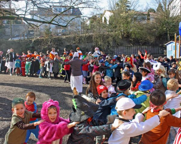 Die Klassen beginnen am Morgen mit einem gemeinsamen Fasnachtsfrühstück im Klassenzimmer. An diesem Tag gibt es natürlich viele Naschereien, die ansonsten nicht zu einem gesunden Frühstück zählen würden.