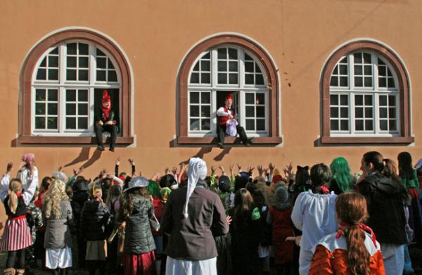 Gestärkt lassen sich die Kinder und Lehrer gerne von den Narren befreien und sammeln sich auf dem Pausenhof.