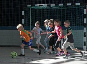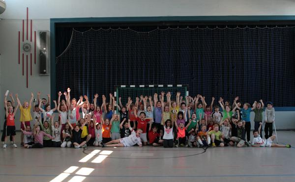 Bei diesem Turnier treten die dritten Klassen und die vierten Klassen gegeneinander an. Ein Teil der Klasse spielt Fußball, die anderen Kinder kämpfen beim Völkerball um den Sieg.