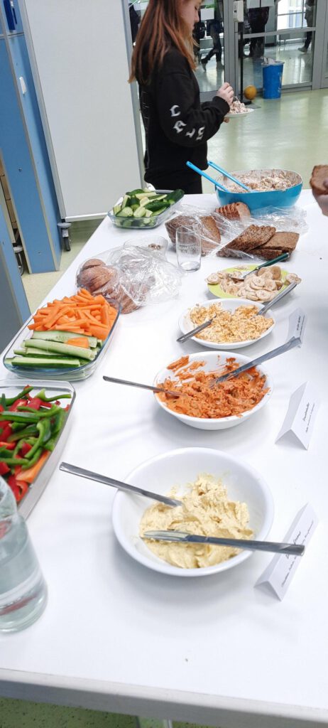 Die letzte Station endete in der Schulküche. Dort bekam jede Klasse einen Verantwortungsbereich zugeteilt: Aufstriche, Gemüsesticks, Bircher Müsli und ein selbstgemachter Eistee wurden von je einer Gruppe für Alle zubereitet.