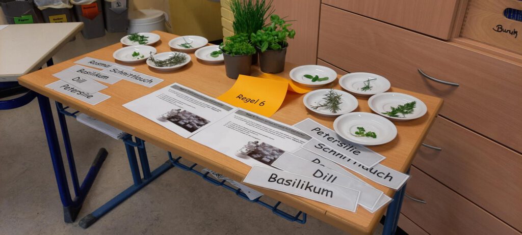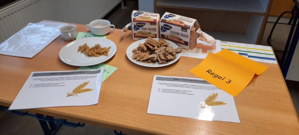 Im Anschluss ging es dann weiter zu Station Nummer 3. Hier wurden die 10 Regeln zur gesunden Ernährung unter die Lupe genommen. Mit Schmexperimenten (Verkostung von Lebensmitteln), Seilhüpfübungen, oder Zuordnungsspielen konnten sich die Schüler*innen die 10 Regeln selbständig erarbeiten. Dabei konnte so einiges über eine gesunde Ernährung gelernt, geschmeckt und erprobt werden. Etliche Kinder mussten zu ihrer Überraschung feststellen, dass Vollkornnudeln oder ein Smoothie doch gar nicht so schlecht schmecken. Auch der Kuchen ohne industriellen Zucker kam bei den Schüler*innen sehr gut an.