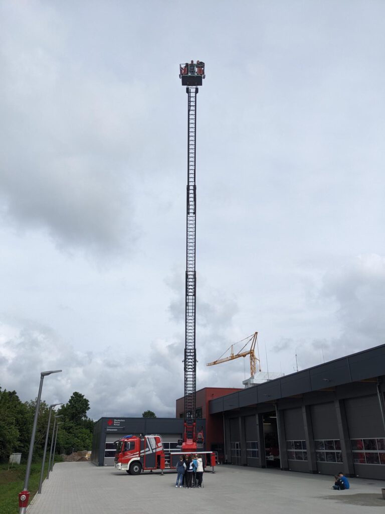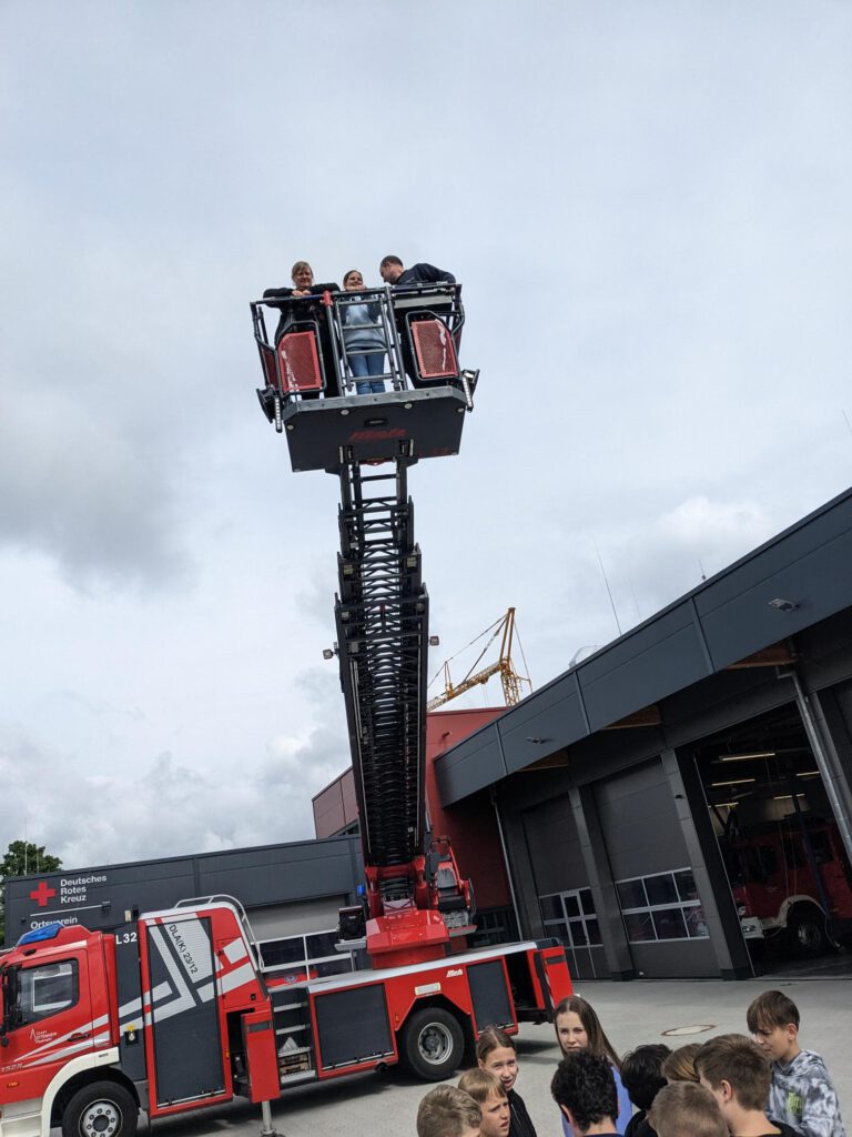 Unter der Anleitung von Berufsfeuerwehrmann Harald Heiler durften die Klassen selbst ausprobieren, wie man Feuer mit einem Feuerlöscher bekämpft. Zum Abschluss ging es mit der Drehleiter in schwindelerregende Höhen, was bei allen Kindern auf große Begeisterung stieß.
